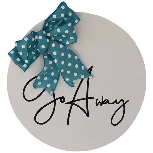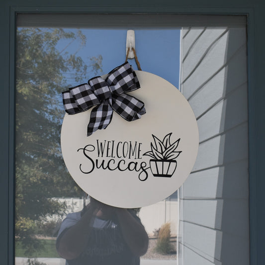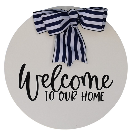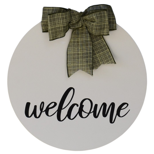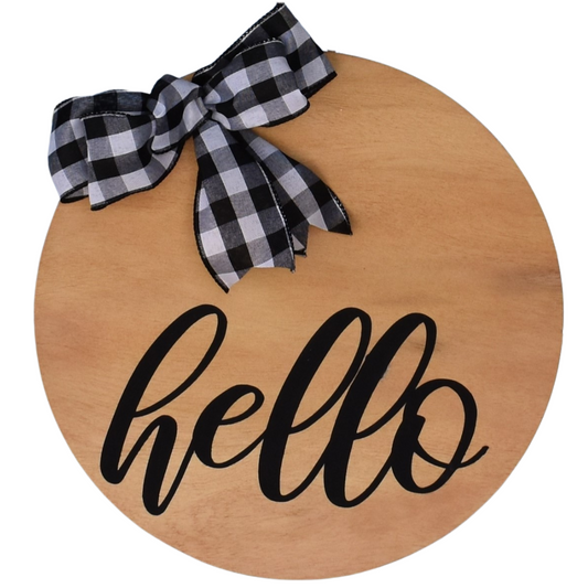 All of our door signs are stained or painted using exterior paint, on 1/4" plywood with a jute string attached with several staples and bumper pads at the bottom of the back of each sign to protect the door or wall. The bows can be changed on request. We love custom orders!